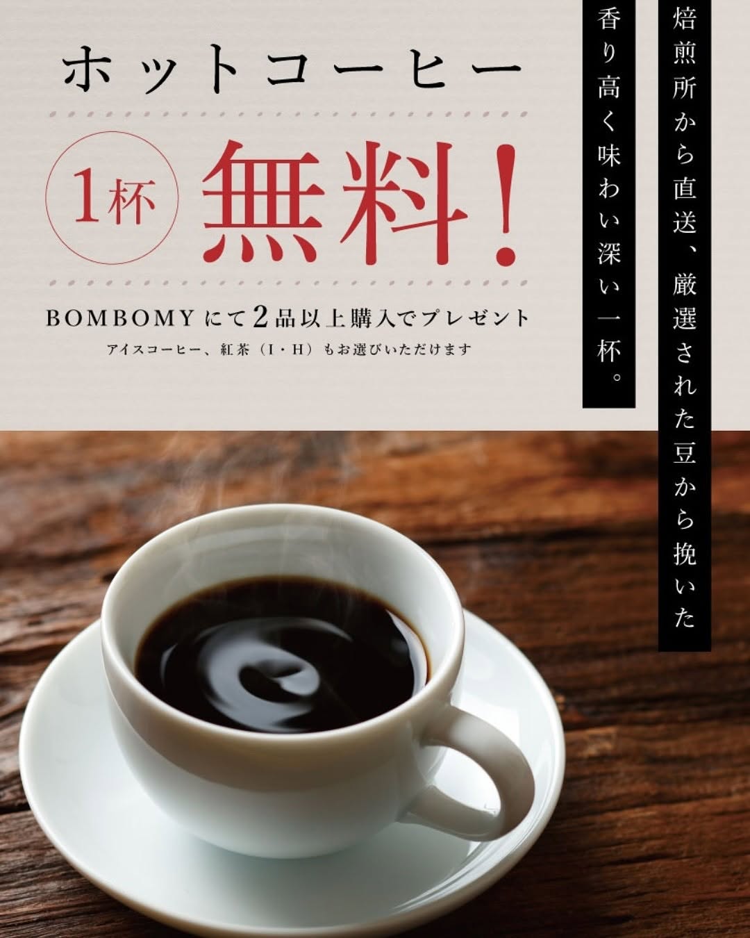 ただいまBOMBOMYでは、2品以上お買い上げいただいたお客様に、コーヒーor紅茶を1杯無料でプレゼント中!